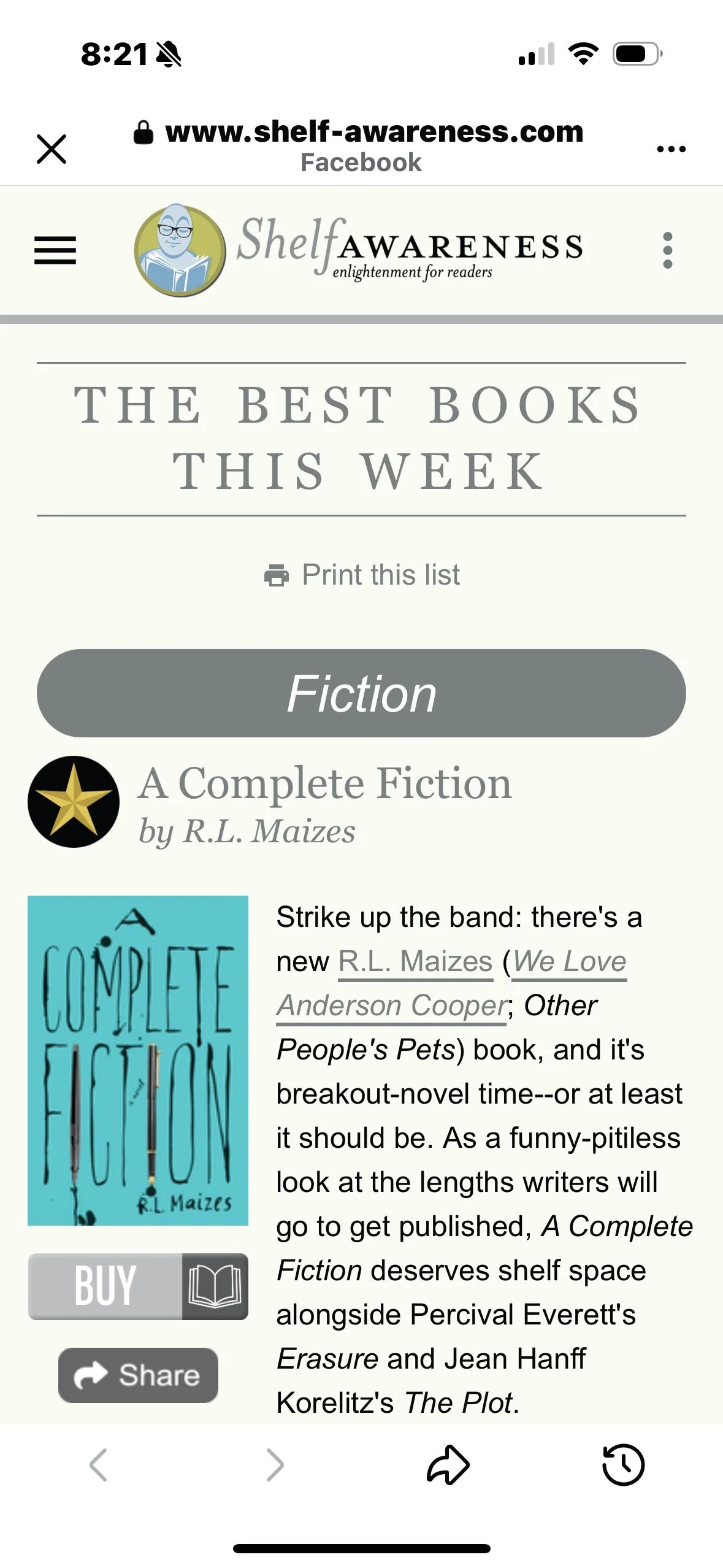 A Complete Fiction named a Book of the Week by Shelf Awareness! Read full review here.